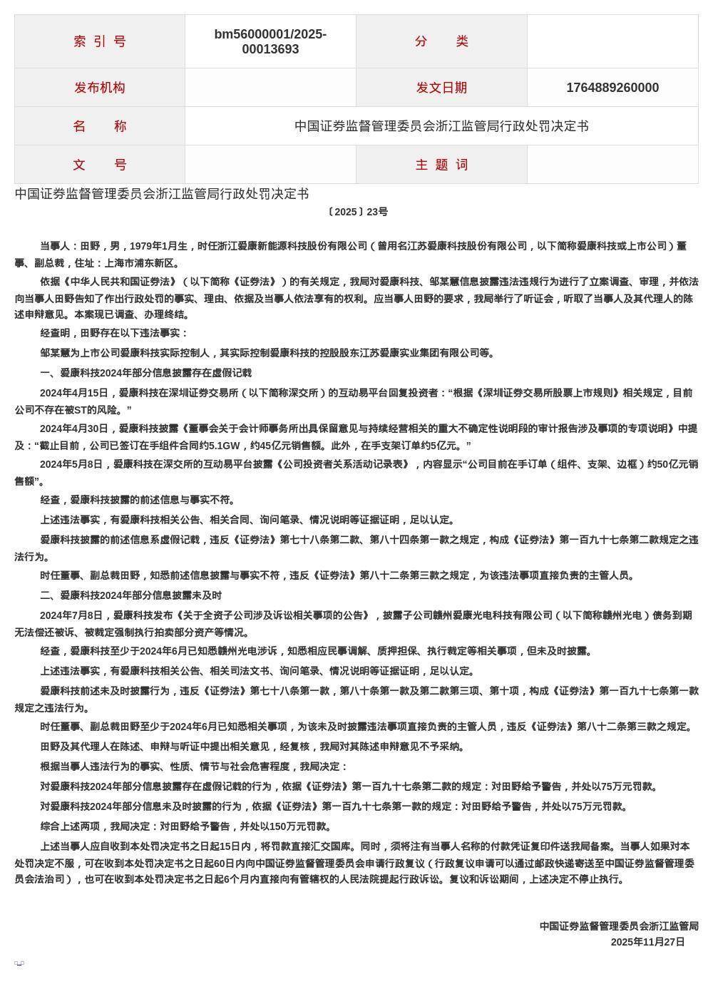 决定书显示,爱康科技2024年部分信息披露存在虚假记载;爱康科技2024年部分信息披露未及时。田野作为爱康科技的时任董事、副总裁,对上述违法行为负有直接责任,违反了《证券法》的相关规定。